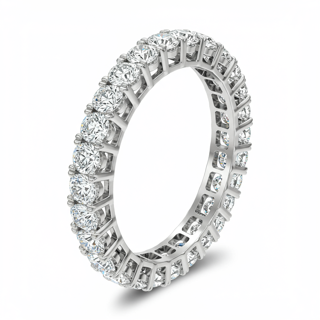 The Eternity Ring embodies everlasting commitment, designed with a continuous circle of impeccably matched diamonds. Crafted in luxurious 18KT white gold, the shared prong setting maximizes light exposure, ensuring breathtaking brilliance from every angle. This timeless band serves as the perfect wedding ring, anniversary gift, or elegant stacking piece. Its classic design guarantees enduring elegance and sophistication for a lifetime of wear.
