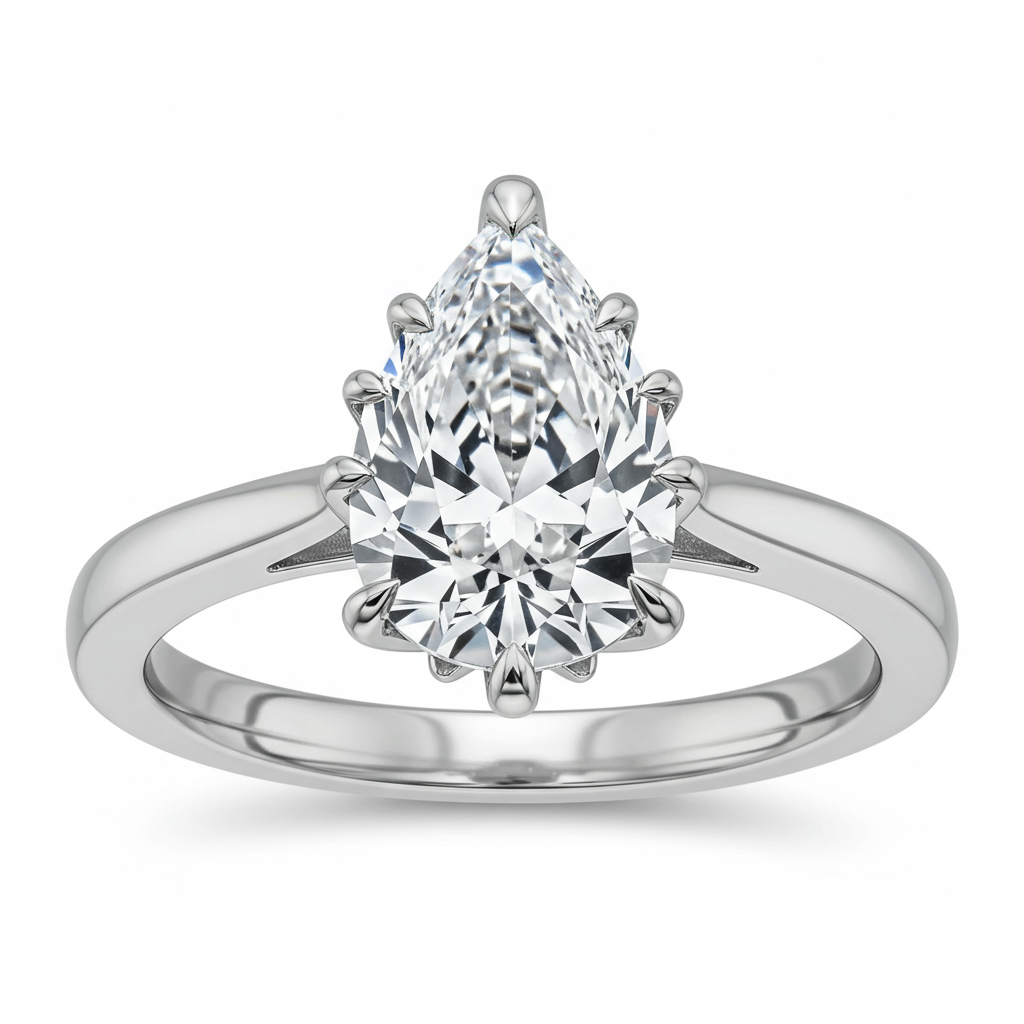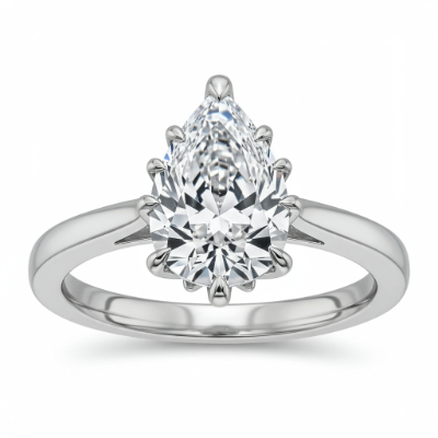 This exquisite engagement ring features a stunning central pear-shaped diamond set delicately on an elegant, smooth band. Crafted entirely in polished 18KT white gold, the sophisticated setting enhances the brilliance and unique silhouette of the main stone. The minimalist band directs all attention to the centerpiece, which is secured by delicate prongs for maximum light exposure. It is a symbol of enduring commitment and refined style, perfect for celebrating eternal love.