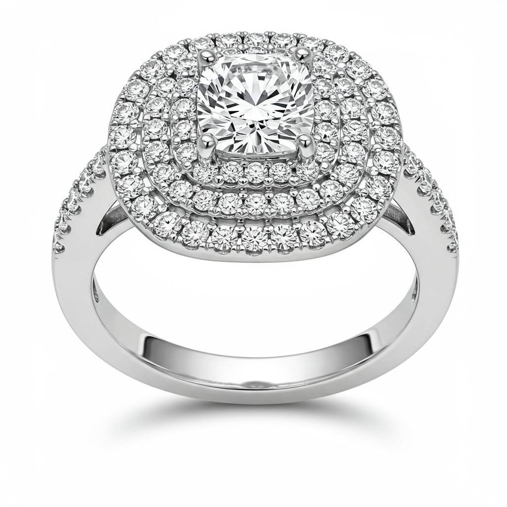 Inspired by epic fantasy, the 'Rings of Power Season 3' ring is a commanding statement piece, capturing the grandeur of ancient lore. It features a stunning central cushion-cut diamond surrounded by a double halo of meticulously set round brilliant diamonds. Crafted in radiant 18KT white gold, this ring symbolizes unbreakable commitment and magnificent strength. The intricate pave detailing along the shank elevates its regal presence, ensuring it is destined to become a treasured heirloom.