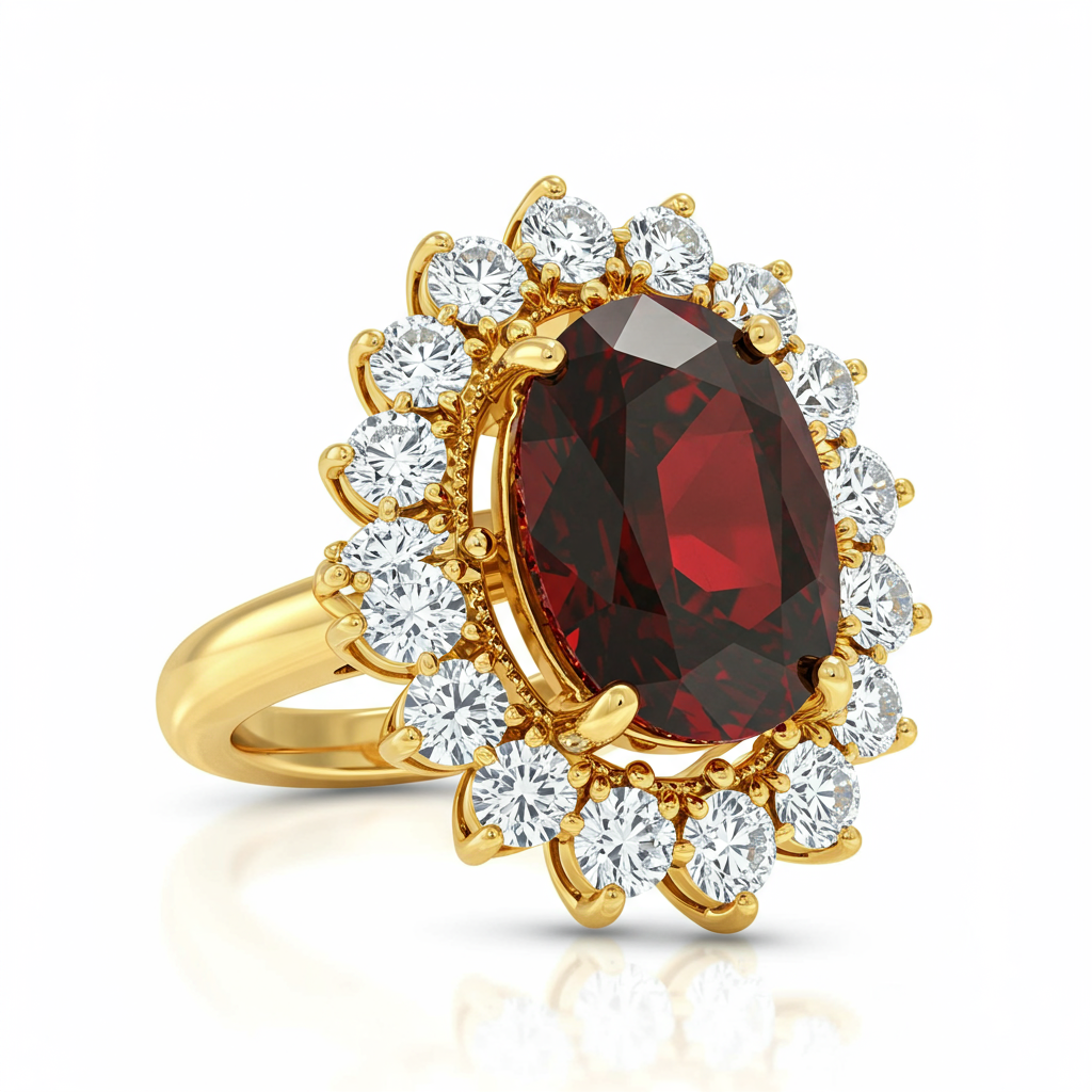 The 'sam lord of the rings' cocktail ring captures the grandeur of legendary lore, meticulously crafted in radiant 18KT yellow gold. This elaborate design features an impressive central structure, symbolizing great power and resilience, centered by a deep red Mozambique Garnet. Encircling the main design are numerous brilliant-cut VVS diamonds, creating an unstoppable stream of light and fire. This piece is a true masterpiece of fantasy and high jewelry, designed for the wearer who commands attention and embodies strength.