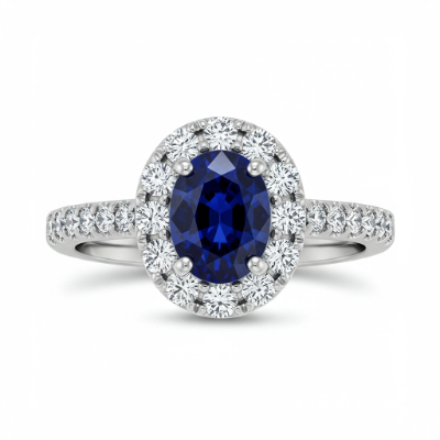 This exquisite ring centers around a deep, vibrant oval blue sapphire, encircled by a brilliant diamond halo for maximum sparkle. Crafted in luxurious 18KT white gold, the classic silhouette is both timeless and sophisticated. The shank is delicately set with pavé diamonds, enhancing the overall brilliance and refined profile. It serves as a perfect symbol of everlasting commitment and impeccable taste.
