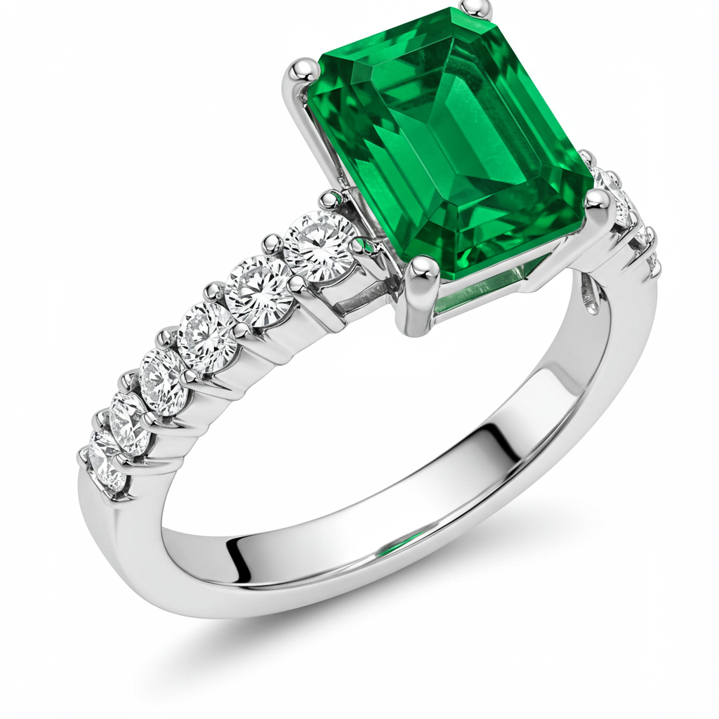 The Emerald Solitaire Ring is a masterpiece of classic elegance, showcasing a magnificent 2.50 carat emerald-cut centerpiece. Set in luminous 18KT white gold, this vibrant gemstone is flanked by precise pavé accents of VVS diamonds, adding a subtle yet spectacular frame of fire. The clean lines and elevated setting allow maximum light penetration, enhancing the deep, natural green hue of the emerald. This ring is a true symbol of sophistication and timeless luxury, perfect for commemorating life's grandest moments.