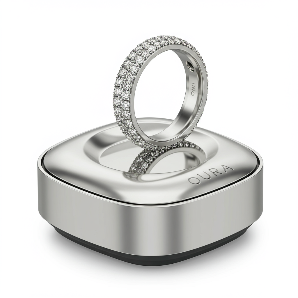 The Oura Ring Charger transcends typical functionality, transforming into a sculptural piece of art for your desk or nightstand. Crafted meticulously in 18KT white gold, this charging cradle is an elegant enhancement for your smart ring accessory. The delicate ring well is paved with brilliant VVS diamonds, adding a discreet layer of luxury to a necessary daily routine. It combines modern technology integration with timeless, high-jewelry craftsmanship, ensuring your device rests in unparalleled style.