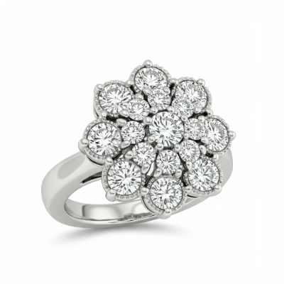Experience refined elegance with this exquisite cluster ring, meticulously crafted in radiant 18KT white gold. Featuring a constellation of 35 VVS round brilliant diamonds, the design captures light from every angle, creating unparalleled sparkle. This statement piece is perfect for milestone celebrations or as a luxurious addition to a sophisticated jewelry collection. Its substantial setting and impeccable craftsmanship guarantee enduring beauty and prestige.
