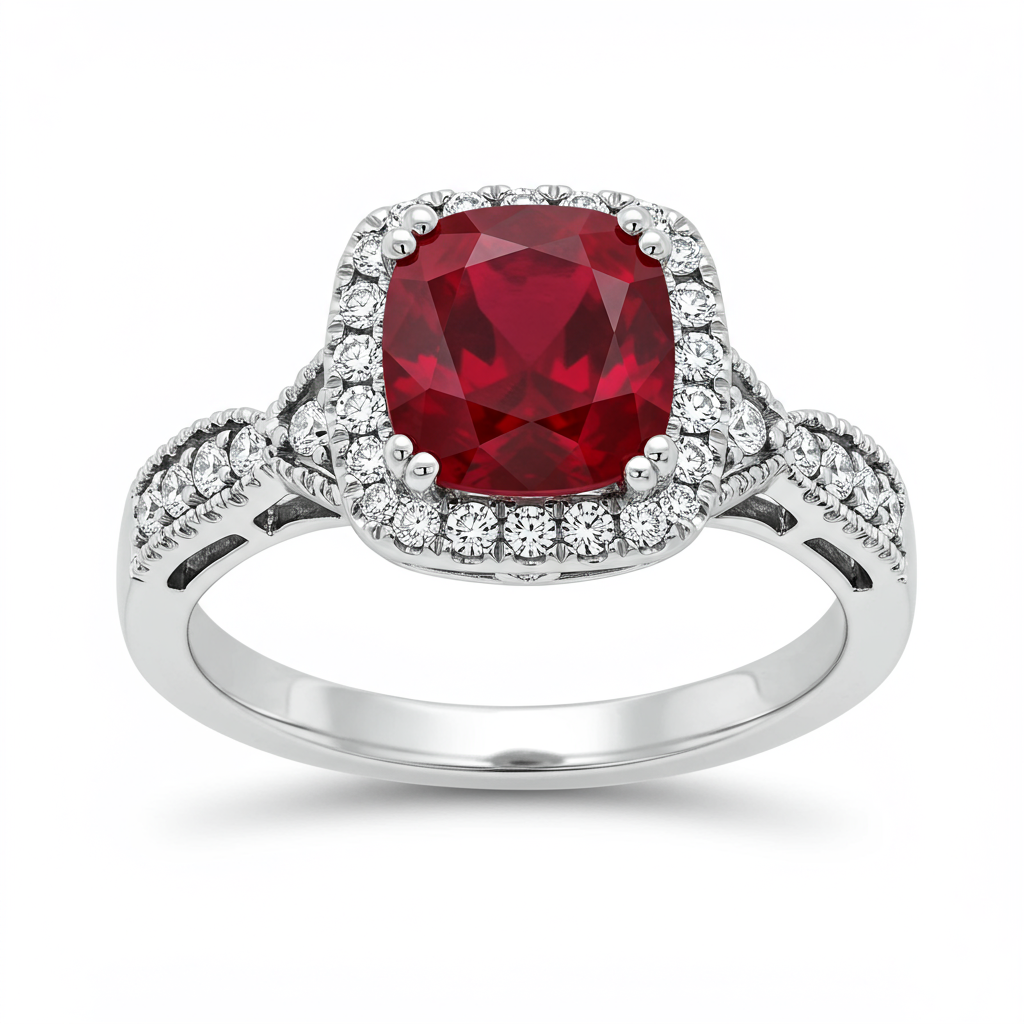 This exquisite ruby ring features a stunning, rich red centerpiece surrounded by a brilliant diamond halo. Crafted in lustrous 18KT white gold, the design is both classic and breathtakingly elegant. The central cushion-cut natural ruby is accentuated by micro-pave set diamonds extending down the slender band, ensuring maximum sparkle from every angle. It is the perfect statement piece for monumental occasions or as a cherished heirloom.