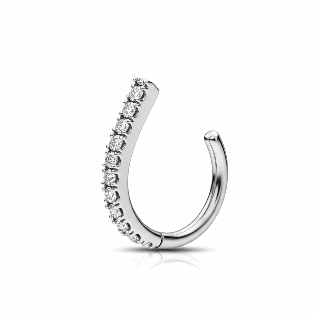 The epitome of understated luxury, this septum ring elevates piercing jewelry to fine art. Crafted in polished 18KT white gold, the elegant, hinged clicker design ensures both comfort and absolute security. It features a continuous stream of micro-pave set VVS diamonds that capture light from every subtle movement. This exquisite piece offers a sophisticated sparkle, perfect for the discerning collector seeking refined self-expression and unparalleled quality.