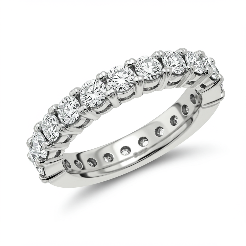 The Tiffany Wedding Ring epitomizes timeless elegance and enduring commitment. Crafted in flawless 18KT white gold, this classic band features a brilliant array of high-quality VVS round diamonds set seamlessly into the metal. Its enduring design ensures both comfort and spectacular sparkle, symbolizing an eternal bond. This exquisite piece serves as a perfect testament to sophisticated taste and lasting devotion.