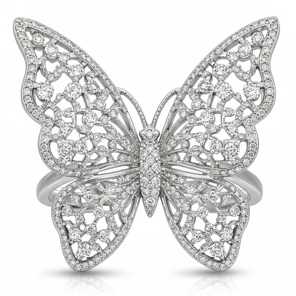 The Butterfly Ring captures the ephemeral beauty of nature, exquisitely rendered in polished 18KT white gold. Its elaborate design features two majestic wings meticulously paved with high-quality VVS diamonds, maximizing sparkle and presence. This stunning cocktail piece wraps elegantly around the finger, offering unparalleled brilliance and sophistication. It serves as a true statement of luxurious freedom and timeless grace, perfect for grand occasions and formal wear.