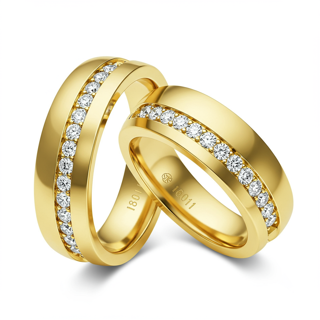 These classic gold wedding rings symbolize eternal devotion and commitment, crafted to perfection in flawless 18KT yellow gold. The bands feature a timeless, highly polished finish that reflects light beautifully, emphasizing the metal's rich luster. A subtle scattering of high-grade diamonds adds just the right touch of sparkle without compromising the band's traditional appeal. The substantial yet comfortable weight ensures daily wearability for a lifetime of cherished memories. This iconic design represents the purity and permanence of enduring love.