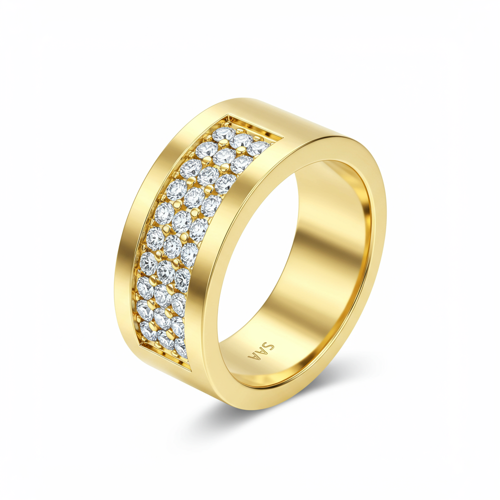 This distinguished hermes ring captures classic European luxury with its bold, signature silhouette crafted in radiant 18KT yellow gold. The wide band features a central channel meticulously set with forty-five pristine VVS Round diamonds, maximizing brilliance across the structure. Engineered for comfort and daily wear, this piece is an iconic statement of enduring style and unparalleled craftsmanship. It serves as a perfect symbol of sophistication, effortlessly elevating any ensemble.