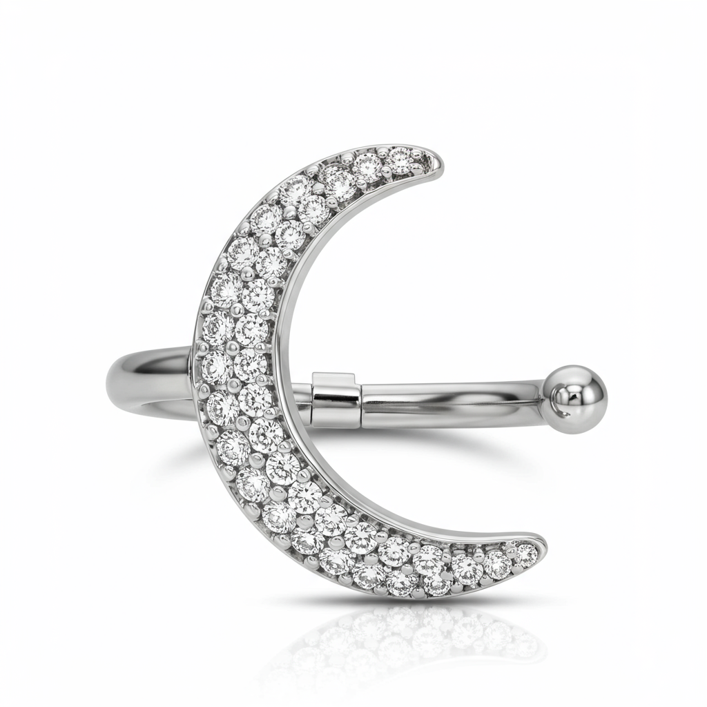 The ultimate expression of intimate luxury, this delicate piercing ring is meticulously crafted from 18KT white gold. It features a secure hinged closure mechanism, ensuring supreme comfort and reliability for prolonged wear. The front crescent segment is fully paved with brilliant VVS G-color diamonds, catching light with every subtle movement. This high-impact piece transforms basic body adornment into a sophisticated, luxurious statement.