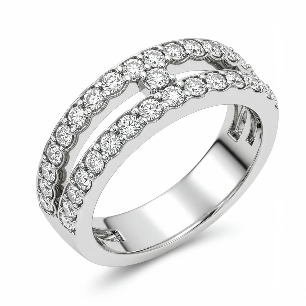 The 'ring toss game' band captures a moment of spontaneous elegance in its intricate design. Crafted in luminous 18KT white gold, this piece features three staggered rows of brilliant round diamonds, totaling 1.70 carats. Each VVS-clarity stone is meticulously set to maximize light return, creating a mesmerizing sparkle from every angle. This luxurious band is the perfect statement piece, symbolizing joyous complexity and unparalleled craftsmanship.
