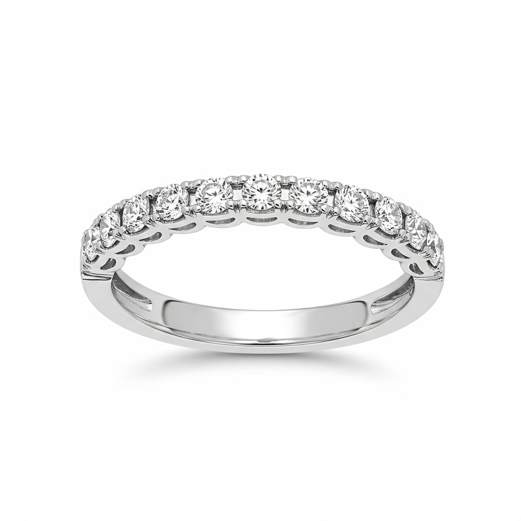 This exquisite wedding band is crafted in polished 18KT white gold, symbolizing eternal love and commitment. It features a stunning half-eternity design meticulously set with brilliant round diamonds. The delicate pave setting maximizes sparkle, allowing the high-quality VVS stones to shimmer with every movement. This ring is designed to perfectly complement an engagement solitaire or stand beautifully on its own as a testament to enduring elegance.