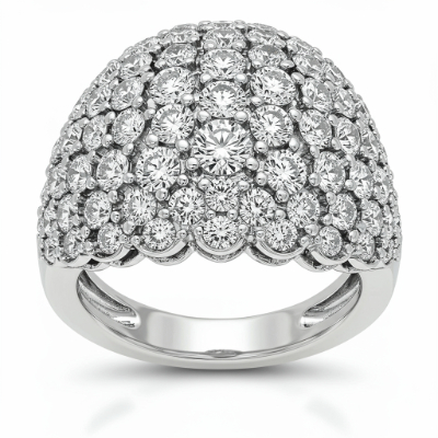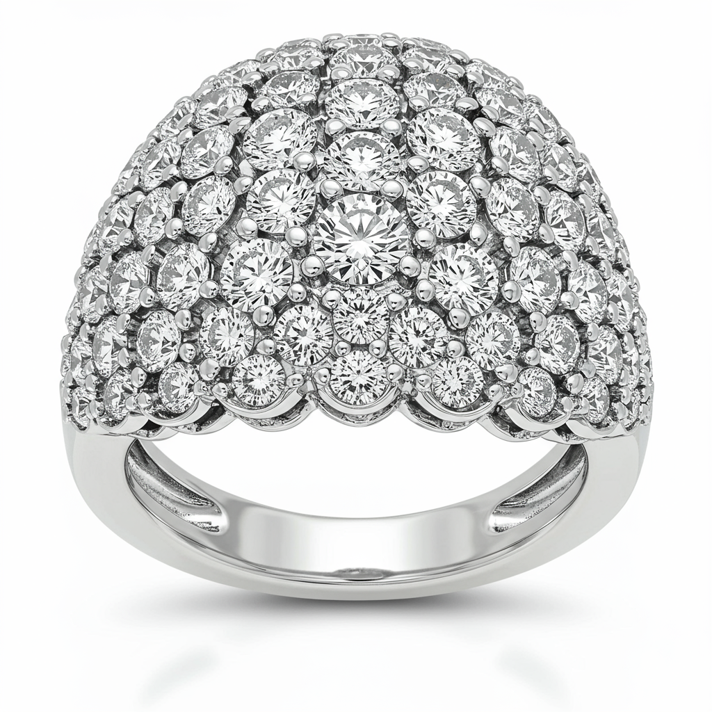 The 'bey ring' is an architectural masterpiece, featuring a voluminous dome silhouette crafted in brilliant 18KT white gold. It showcases a meticulously set cluster of high-clarity VVS diamonds that capture and amplify light from every angle. This dramatic yet elegant piece provides commanding presence, perfect for formal events or as a sophisticated cocktail statement. Its seamless construction ensures comfort while delivering unparalleled sparkle.