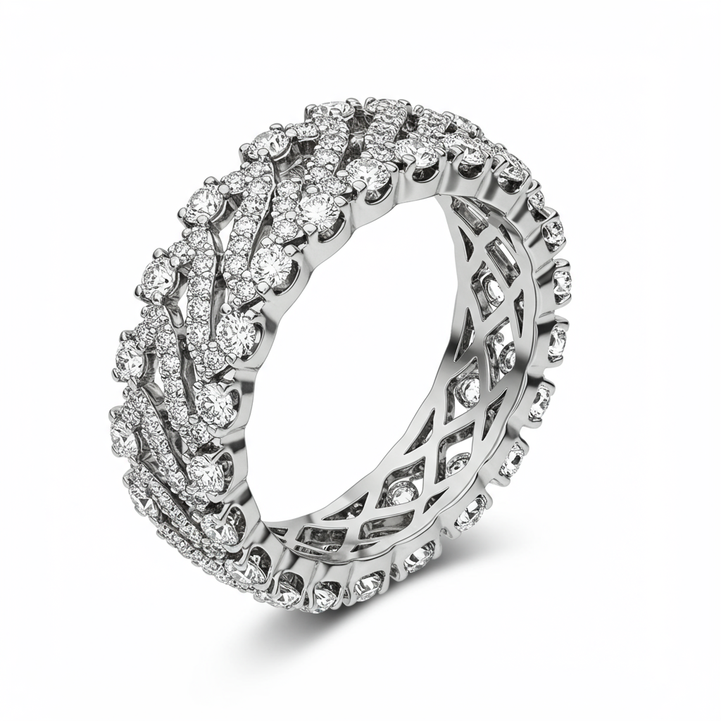 The Crochet Ring is a masterpiece of fine craftsmanship, mimicking the delicate, woven texture of lace rendered in solid 18KT gold. This sophisticated band is meticulously set with 75 brilliant VVS diamonds that capture light from every angle, creating a shimmering, continuous surface. Its intricate design makes it perfect as a luxurious stackable piece or an elegant wedding band. Experience the unique fusion of timeless textile art and modern high jewelry precision.