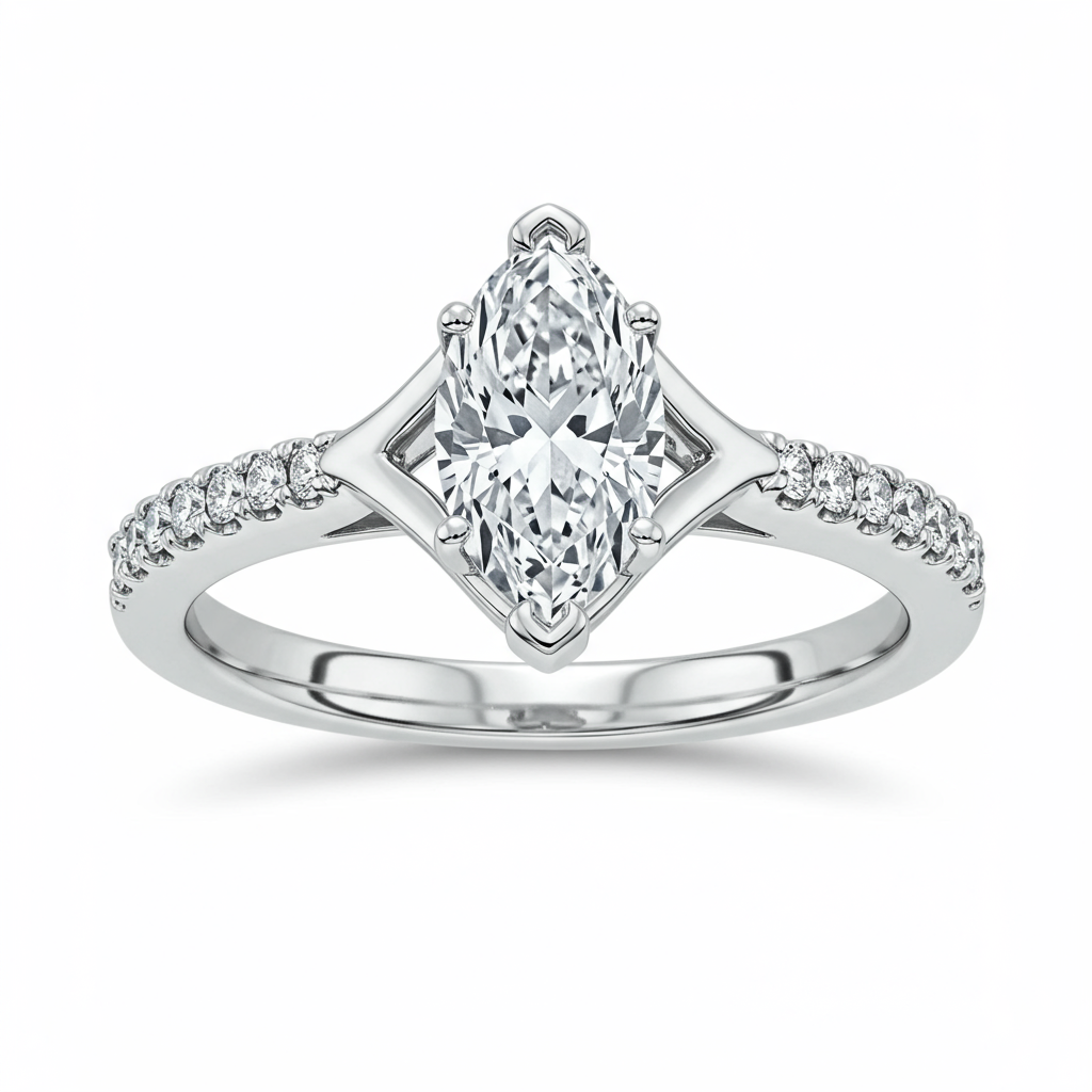 This stunning marquise diamond engagement ring captures light with exceptional brilliance, showcasing the unique elliptical shape of the center stone. Set in lustrous 18KT white gold, the sophisticated V-prong setting maximizes the diamond's size and radiance. The delicate band is expertly lined with micro-pave diamonds, adding a captivating sparkle that complements the magnificent focal point. This ring is the perfect symbol of enduring luxury and bespoke craftsmanship, designed for the modern bride. The high-quality VVS diamonds ensure a lifetime of fire and brilliance.