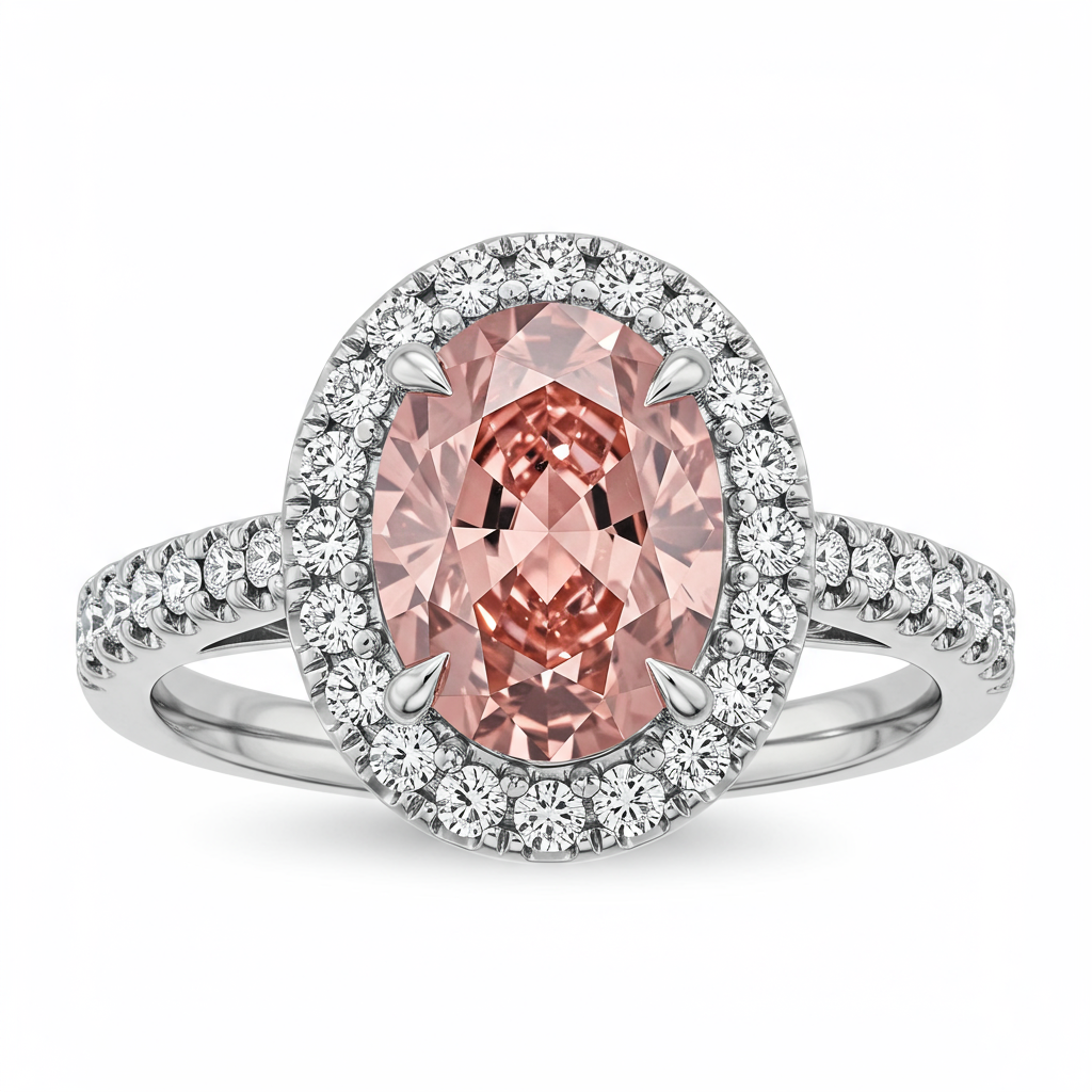 This breathtaking ring features a rare Fancy Pink diamond as its centerpiece, elegantly framed by a precise halo of brilliant white diamonds. Crafted in lustrous 18KT white gold, the setting is meticulously designed to maximize light return, enhancing the exceptional color saturation of the main stone. It is a symbol of profound romance and exquisite craftsmanship, destined to become a cherished heirloom. This magnificent piece perfectly balances classic glamour with modern design principles.