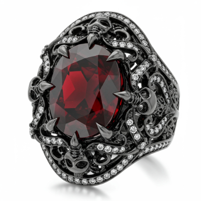 The Necromancer Ring captures the dark majesty of Middle-earth's most shadowy figures, translating high fantasy into high jewelry. Crafted in 18KT white gold and finished with deep black rhodium, the sculpted structure cradles a menacing central oval garnet surrounded by brilliant VVS diamond pave. This imposing piece features intricate gothic filigree, symbolizing ancient power and forgotten secrets. It is a powerful statement accessory designed for those who command the shadows and appreciate dramatic design.