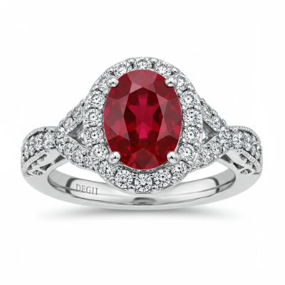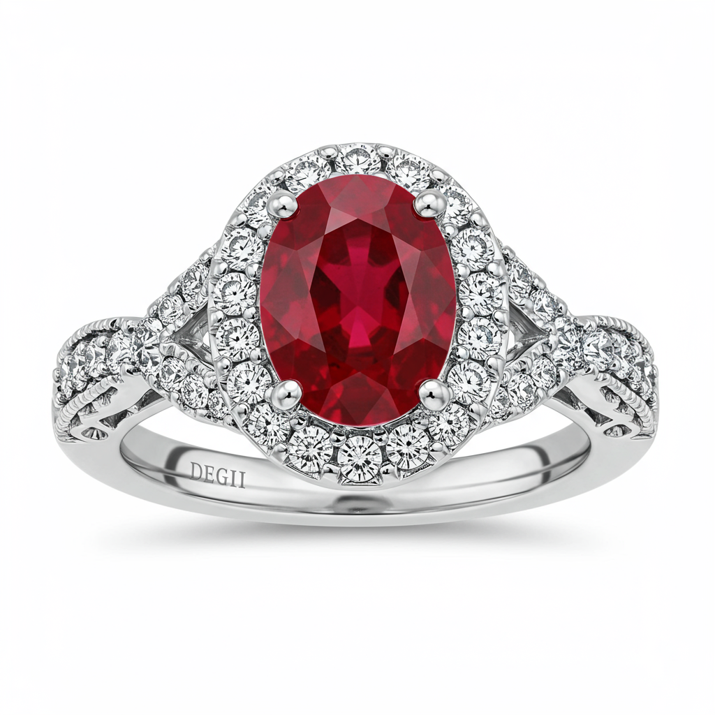 The Ruby Halo Engagement Ring captures timeless elegance, centering a vibrant, deep red oval-cut ruby that symbolizes passionate love. Encircling the majestic center stone is a perfectly matched halo of VVS diamonds, maximizing brilliance and depth. Crafted in radiant 18KT white gold, the slender band is expertly detailed with micro-pave set accent diamonds that extend halfway down the shank. This piece is a magnificent testament to classic design reinvented with superior contemporary craftsmanship.