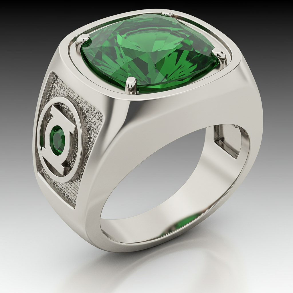 A powerful and iconic statement piece, the Green Lantern Ring captures the essence of willpower and cosmic energy. Crafted in substantial 18KT white gold, this signet ring features a prominent, expertly cut shield-shaped green tourmaline center stone representing the boundless light of the corps. The polished metal band is meticulously sculpted to showcase the legendary insignia, blending high-end luxury with superhero mythology. This ring is a perfect emblem for those who embody fearlessness and strength.