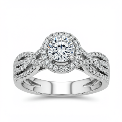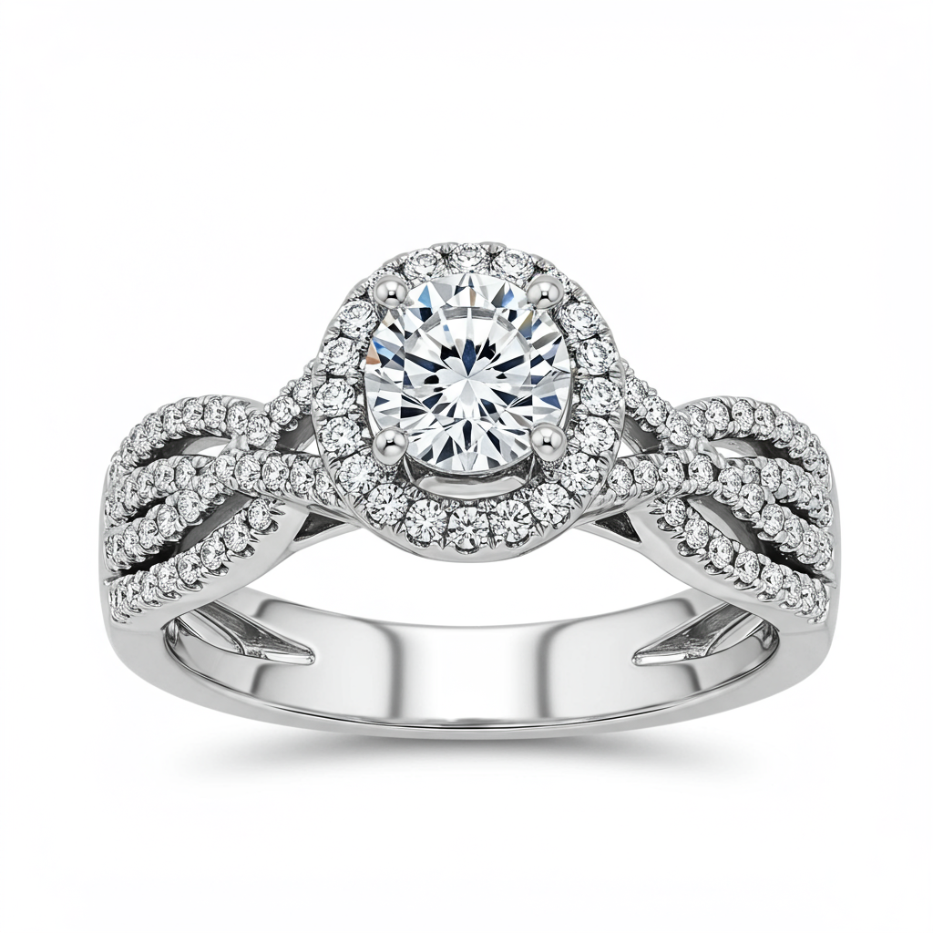 The Rapunzel Pandora Ring captures enchanting elegance with its detailed, braided shank design. At its heart sits a brilliant-cut center stone encircled by a delicate diamond halo, symbolizing enduring love and commitment. Crafted in luminous 18KT white gold, the split shank features finely set micro-pave diamonds that trail down the sides, ensuring maximum sparkle from every angle. This ring is a timeless piece, perfect for engagement or a significant anniversary gift.