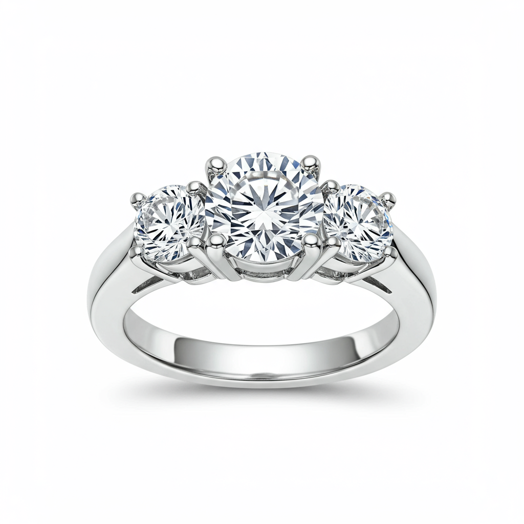 The ultimate expression of enduring love, this magnificent Three-Stone Ring captures light from every angle, crafted for generational heirloom quality. It features three perfectly matched round brilliant diamonds securely set in luxurious 18KT white gold. The central stone is flanked by two radiant diamonds, symbolizing the past, present, and future of your devotion. Crafted with exceptional VVS clarity, this piece ensures unmatched brilliance and sophistication.