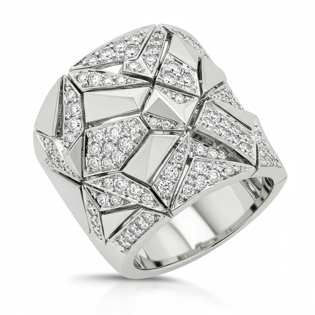 This striking technical statement band is crafted from highly polished 18KT white gold, symbolizing precision and modern elegance. It features a geometrically channeled surface accented by VVS round micro-pave diamonds that sparkle with subtle, yet intense brilliance. Designed for the discerning individual, the ring offers substantial weight and a comfortable interior fit, merging cutting-edge aesthetic with timeless fine jewelry standards. This unique piece elevates everyday wear into an art form, reflecting sophistication and confident style.
