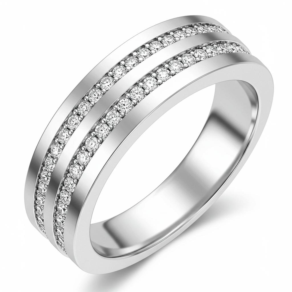 The Groove Ring collection offers a contemporary interpretation of the classic wedding band. Expertly crafted in gleaming 18KT white gold, this band features meticulously carved parallel grooves that add depth and tactile interest. These intricate channels are elegantly punctuated by a continuous line of brilliant VVS round diamonds. This design strikes a perfect balance between architectural precision and timeless sparkle, making it an exceptional piece for daily wear or formal commitment.