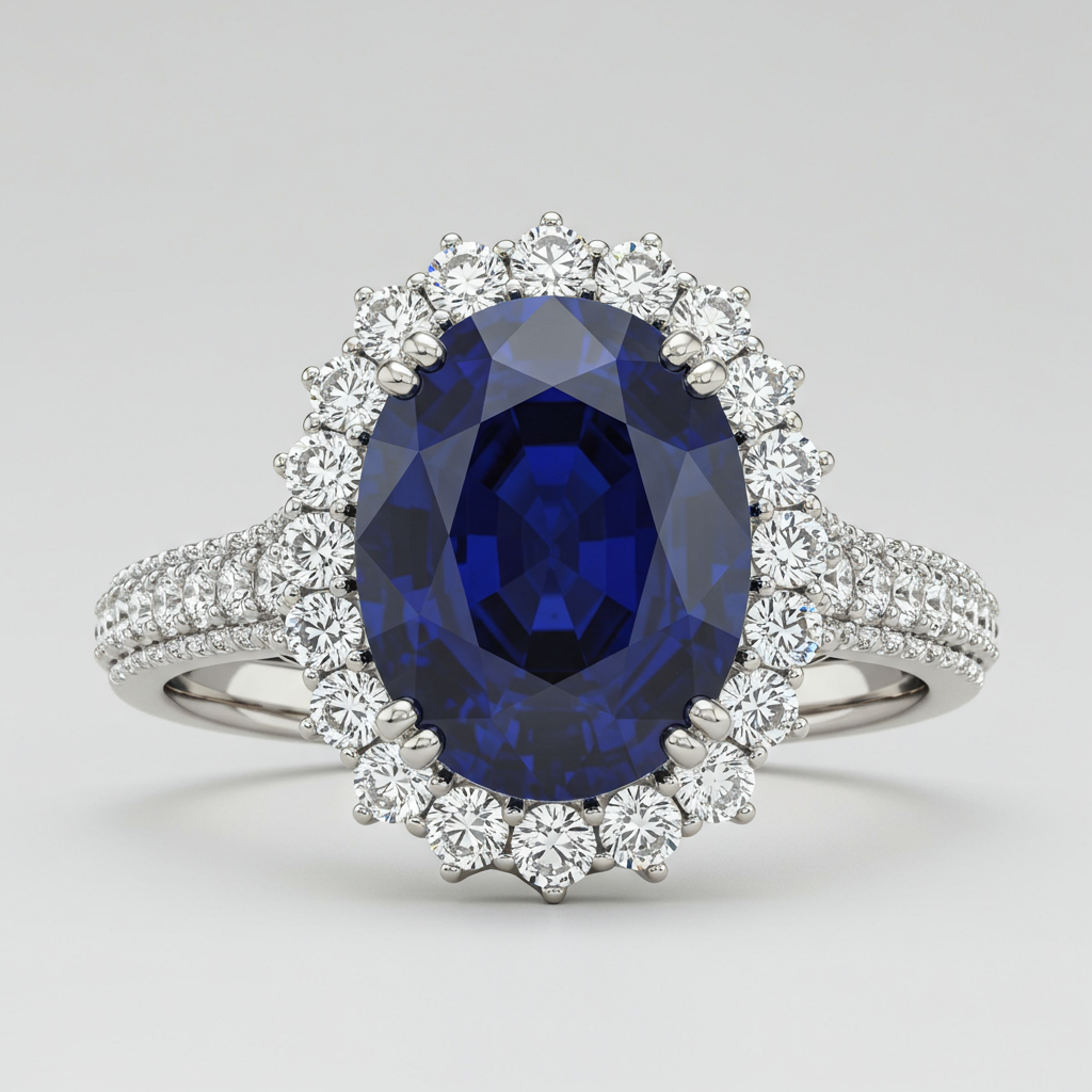 Revisit a timeless royal legacy with this iconic engagement ring, inspired by the style of Princess Diana. It features a majestic oval-cut natural royal blue sapphire as its centerpiece, radiating deep, opulent color. The primary stone is magnificently encircled by a halo of brilliant-cut VVS diamonds, maximizing sparkle and presence. Set in luxurious 18KT white gold, this piece embodies historical elegance and enduring romantic commitment.