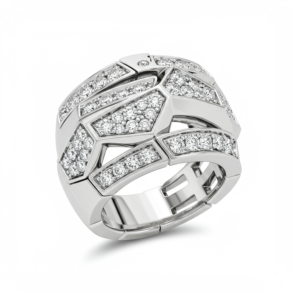 The 'Ring Battery' band captures the essence of continuous brilliance through its powerful, modern architecture. Expertly crafted in lustrous 18KT white gold, this design features interlocking geometric segments fully paved with exceptional VVS clarity diamonds. Its substantial weight and dynamic, fluid construction offer an unparalleled luxurious feel on the finger, symbolizing enduring power and timeless elegance. This high-concept statement piece is built for those who appreciate innovative design merged with traditional craftsmanship.