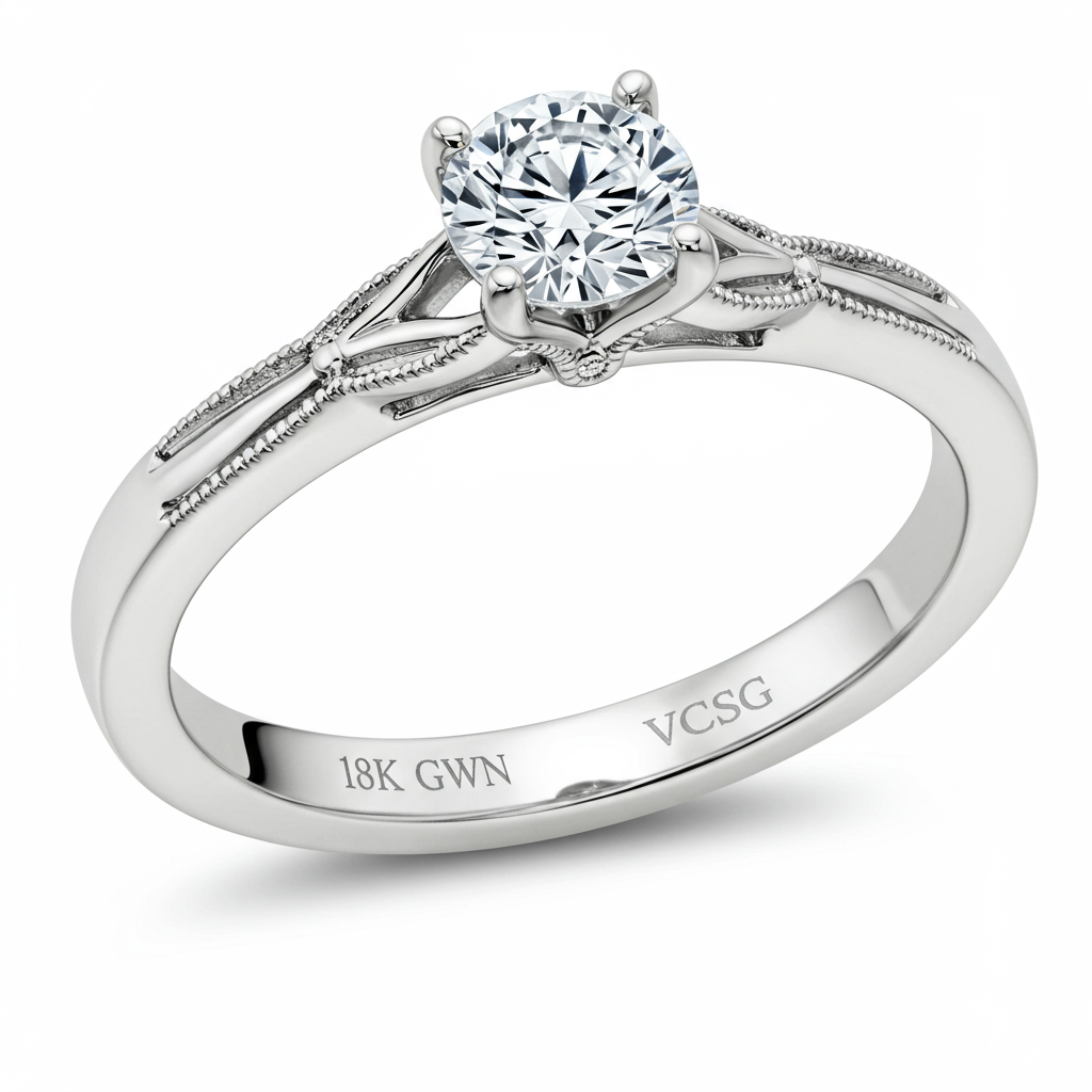 This exquisite engagement ring showcases the perfect harmony of modern design and brilliant ethical luxury. Centered is a magnificent lab-created round diamond, securely held in a classic four-prong setting, maximizing light return and sparkle. The 18KT white gold band provides a timeless foundation, subtly enhanced by precise pavé-set lab diamonds leading up to the centerpiece. This ring is a testament to sustainable sophistication, offering unparalleled fire and brilliance for a momentous commitment.