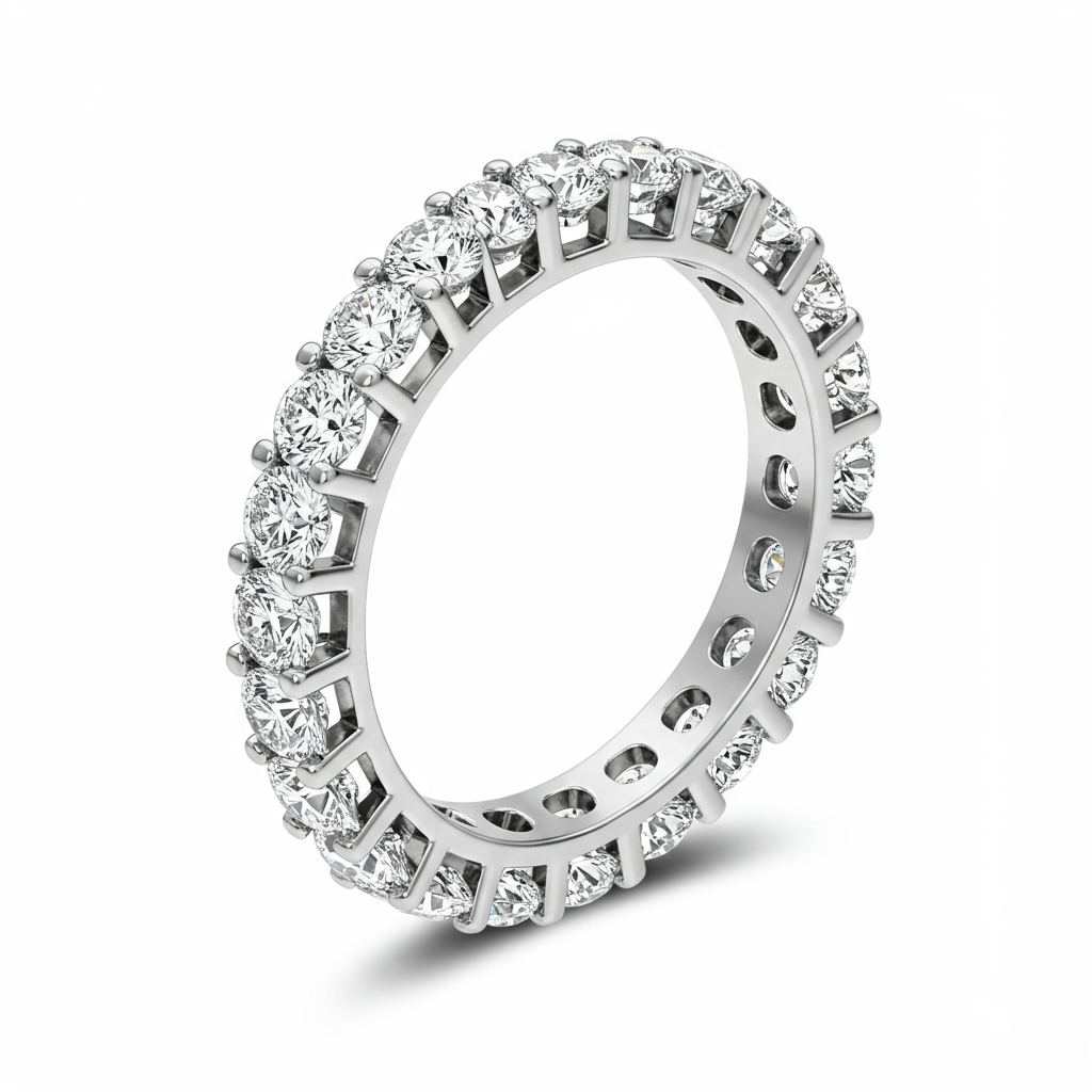 The "SI Rings" Eternity Band captures endless devotion in a continuous stream of light. Expertly crafted in 18KT white gold, this piece features perfectly matched round diamonds set in a secure, yet minimalist shared-prong setting. Each diamond possesses VVS clarity and G color, ensuring a brilliance that spans the entire circumference. This timeless design serves as the quintessential wedding band or a luxurious anniversary gift, symbolizing unbreakable connection and grace.