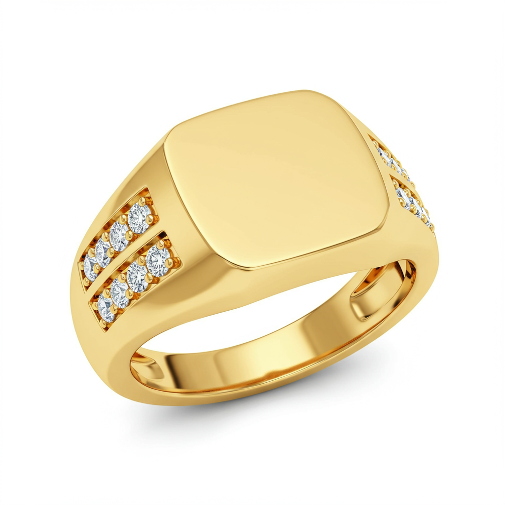 The classic signet ring is masterfully reimagined with substantial weight and contemporary elegance. Crafted in opulent 18KT yellow gold, this piece features a smooth, wide face perfect for personalized engraving or minimalist wear. Subtle pave set VVS diamonds grace the shoulders, adding a touch of discreet brilliance to the robust structure. This timeless accessory serves as a powerful statement of heritage, luxury, and modern refinement.