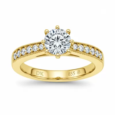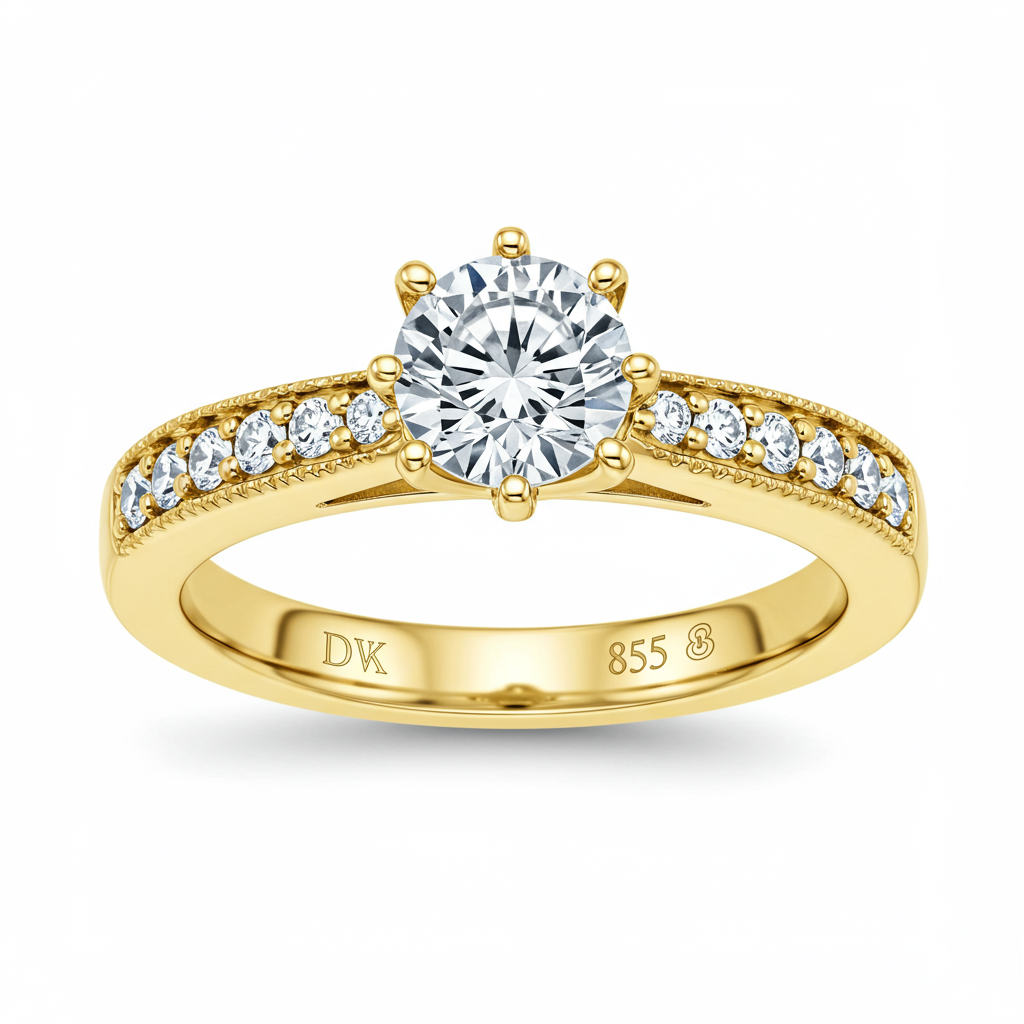 This exquisite solitaire ring captures timeless elegance, expertly crafted in luminous 18KT yellow gold. A brilliant G-color round diamond serves as the stunning centerpiece, secured in a classic four-prong setting. The shoulders of the ring feature delicate pave-set accent diamonds, adding exceptional fire and brilliance to the overall design. This piece is the perfect symbol of commitment and sophisticated luxury, designed for enduring beauty.