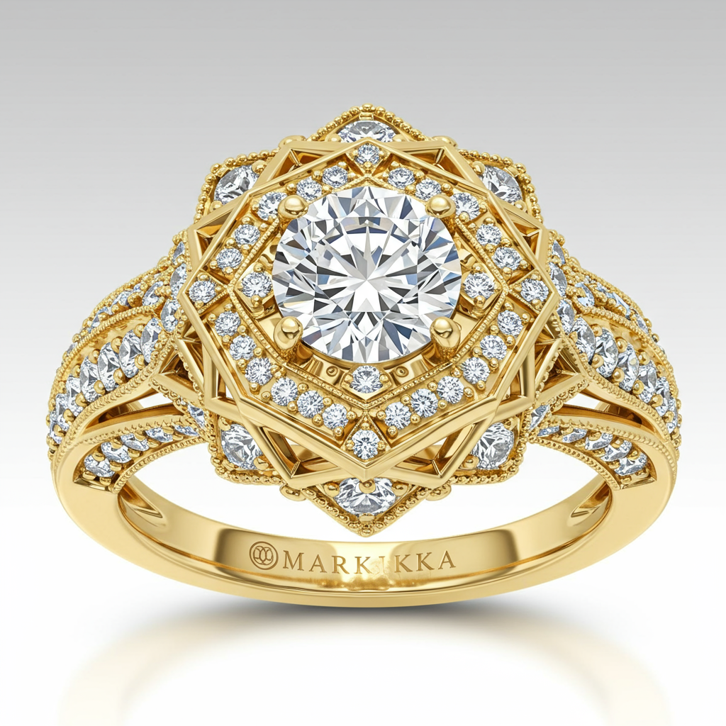 The Marika Elden Ring is a masterful tribute to epic fantasy and unmatched craftsmanship. Set in rich 18KT yellow gold, this dramatic cocktail ring centers on a substantial solitaire diamond cradled by a geometrically inspired halo. The elaborate prong setting and detailed gallery work create an aura of noble power and ancient majesty. This statement piece is designed for those who command attention and appreciate intricate, high-quality design, featuring a total of 2.45 carats of brilliant diamonds.