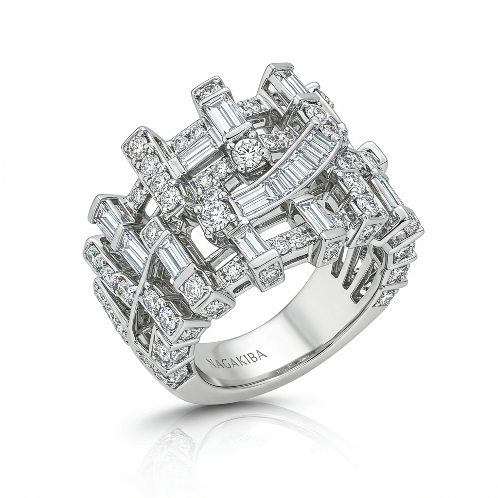 Inspired by the legendary katana, the Nagakiba Elden Ring captures the fierce elegance of its namesake with masterful precision. This statement piece is meticulously crafted in radiant 18KT white gold, featuring an architectural setting that mirrors the blade's powerful aesthetic. It is intricately paved with high-quality VVS diamonds that deliver unparalleled brilliance from every angle. A truly unique and bold design, this ring is perfect for collectors who seek jewelry embodying lore and luxury. Its sophisticated structure ensures comfort while making an undeniable, powerful impact.