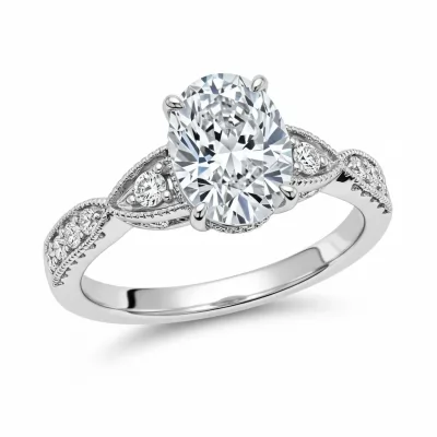 The Taylor Swift inspired engagement ring captures timeless elegance through its delicate design. A stunning 3.00ct oval-cut diamond, graded VVS clarity, takes center stage, radiating exceptional brilliance. This breathtaking focal stone is secured by slender prongs, mounted upon an 18KT white gold band meticulously detailed with micropave diamonds. This ring offers a perfect balance of sophisticated grandeur and modern refinement, symbolizing an enduring romance.