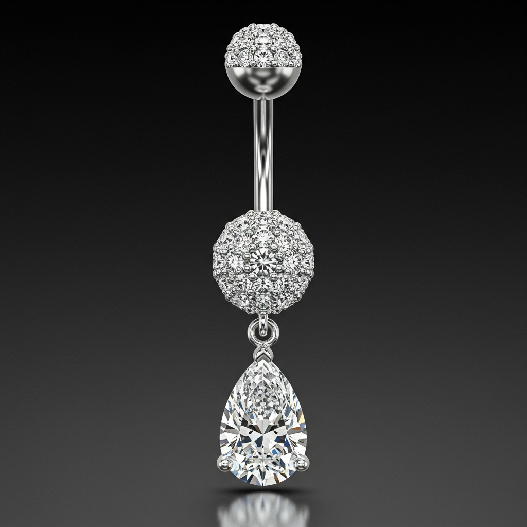 Adorn your piercing with the exquisite allure of this 18KT White Gold Belly Button Ring. This captivating piece features a dazzling inverted pear-cut diamond suspended beneath a micro-pave set upper sphere. Crafted for maximum brilliance and comfort, the piece secures flawlessly, ensuring luxurious wearability day or night. It is the ultimate statement of sophisticated body jewelry, designed to catch every ray of light.