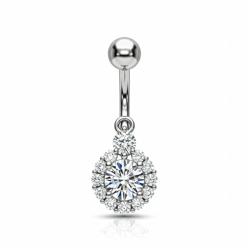 This elegant belly ring features a sleek 18KT white gold barbell supporting a dazzling diamond drop motif. The design showcases a brilliant-cut VVS center diamond, beautifully accented by smaller pavé stones along the bottom curve, creating a cascading light effect. Crafted using only high-quality materials, this piece offers exceptional sparkle and sophistication. It is the perfect accessory for adding a touch of luxury to your everyday style or special occasion wear.