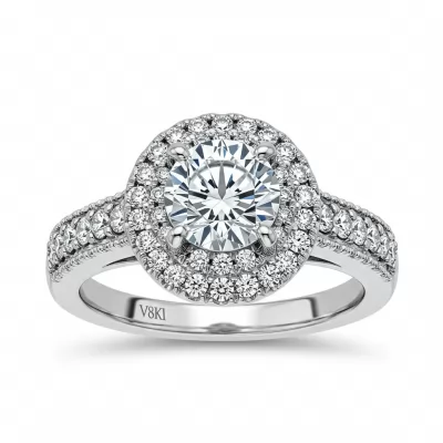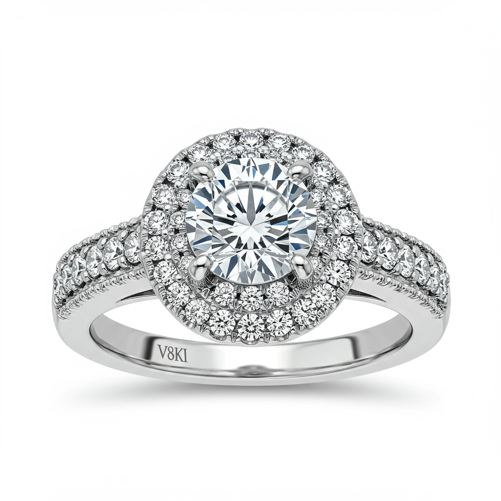 This exquisite halo engagement ring showcases the brilliance of ethically sourced, lab-grown diamonds set in luminous 18KT white gold. A magnificent 1.50 carat round brilliant cut stone commands attention, encircled by a precise halo of micro-pavé diamonds. The VVS clarity and G color grades ensure unparalleled fire and sparkle, making this piece a timeless symbol of enduring love. It masterfully combines classic elegance with modern sustainability, providing luxury without compromise.