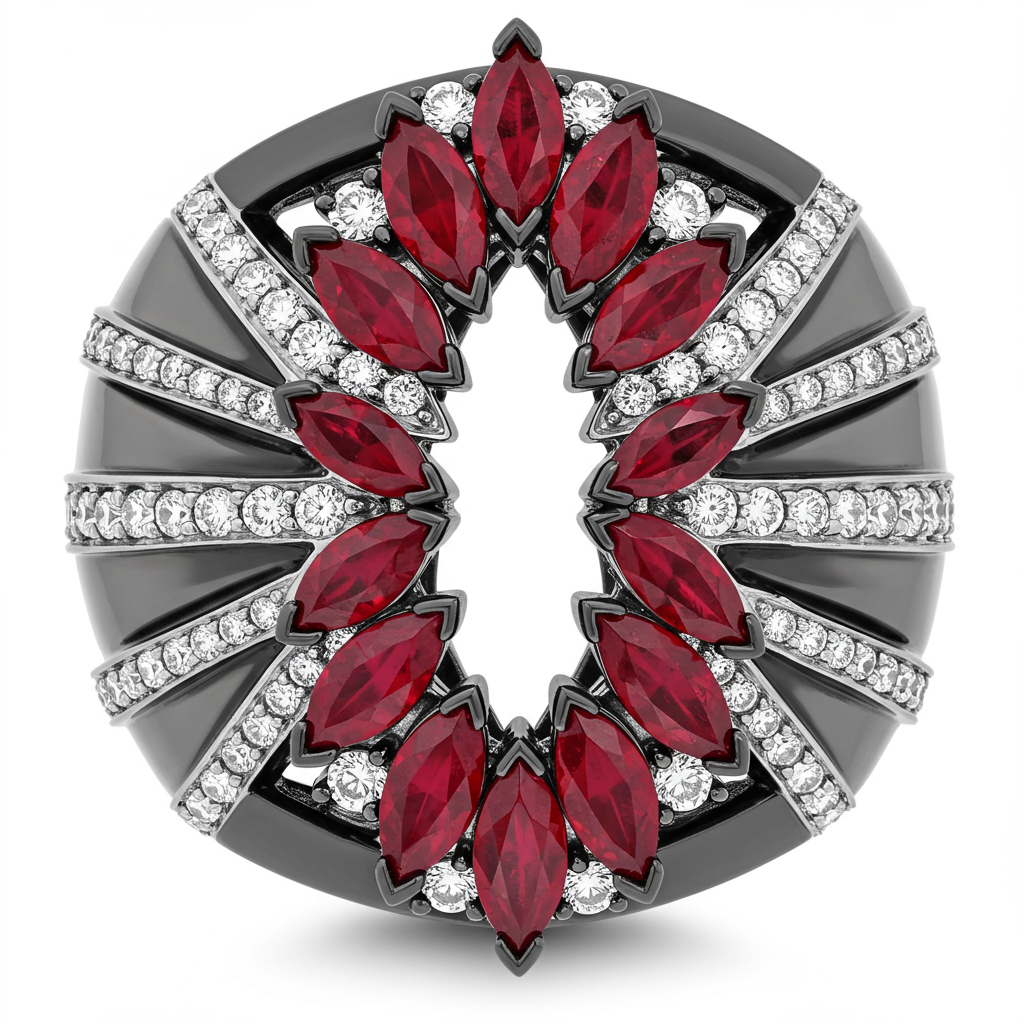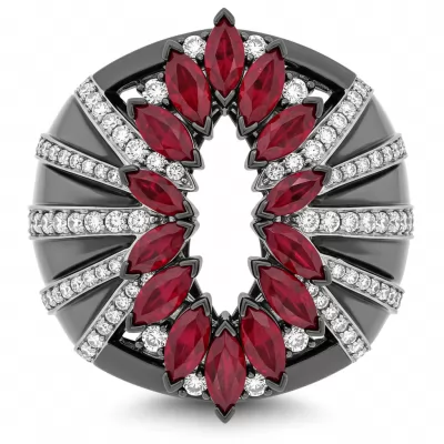 The Rivers of Blood Elden Ring is a dramatic testament to high fantasy jewelry design, capturing the essence of its legendary inspiration. Crafted in 18KT white gold with a deep black rhodium finish, its aggressive form mimics the jagged, flowing blade. The central channel is meticulously set with intense, fiery marquise rubies, symbolizing the crimson torrent. Accent diamonds of VVS quality line the edges, providing a sharp contrast and dazzling light, making this a peerless statement piece for the discerning collector.