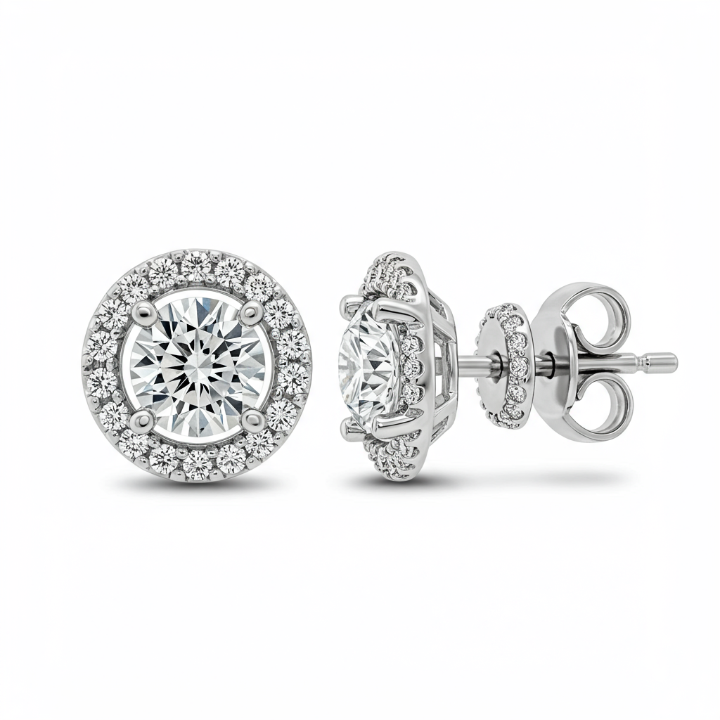 These exquisite halo stud earrings capture light from every angle, crafted in lustrous 18KT white gold. Featuring a brilliant center diamond encircled by a precise micro-pave setting, they offer timeless elegance and dramatic sparkle. The meticulous VVS clarity diamonds ensure unparalleled fire and brilliance. Perfect for sophisticated daily wear or glamorous evening events, these studs are a statement of luxury and refined taste.