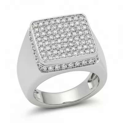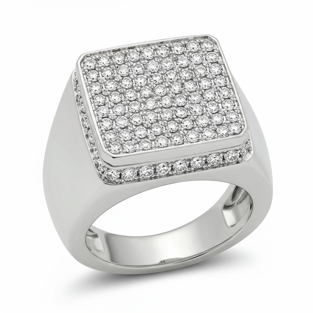 This distinguished signet ring epitomizes modern masculine elegance, crafted in substantial 18KT white gold. The bold geometric head is meticulously paved with brilliant VVS round diamonds, creating a continuous surface of unparalleled sparkle. Its robust, polished band ensures comfortable wear while providing a powerful visual statement. Designed for the discerning gentleman, this ring serves as a timeless emblem of strength and achievement.