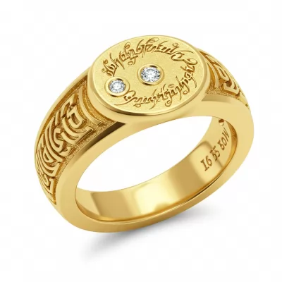 The 'new lord of the rings movie' Signet Ring is a masterpiece of high fantasy design, crafted in rich 18KT yellow gold. It features deep, intricate Elvish-inspired engravings across its robust surface, symbolizing eternal strength and legacy. A single, flawless accent diamond, set flush, captures the light, lending a subtle brilliance to the powerful metalwork. This piece serves as a timeless emblem of adventure and noble craftsmanship, designed for those who seek iconic style and deep meaning.