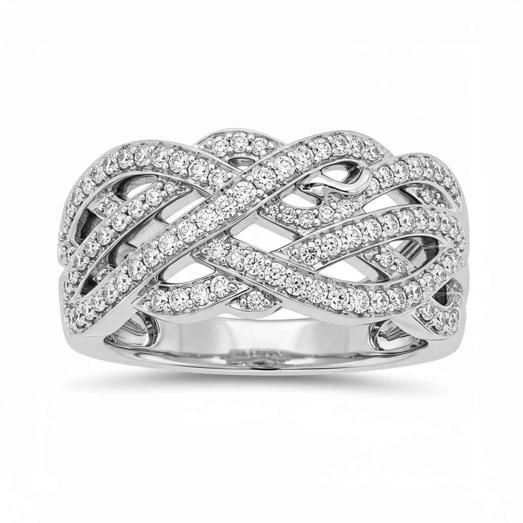 The Pilates Ring embodies movement and strength, capturing fluidity in solid 18KT white gold. Its sculptural, interwoven bands are meticulously pavé set with brilliant VVS diamonds, creating continuous paths of light. This exquisite piece reflects sophisticated modern architecture and unparalleled craftsmanship. Designed for daily wear, the ring offers both powerful structure and delicate sparkle, making it a true statement of grace and endurance.