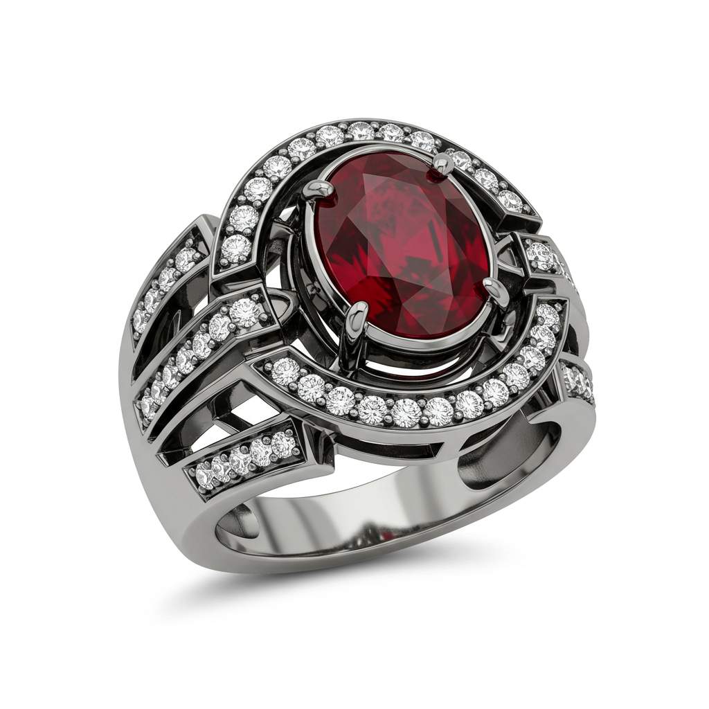 The Blasphemous Blade Elden Ring is a masterful tribute to epic fantasy and dark grandeur. Crafted in substantial 18KT gold, its design captures the fierce elegance of the legendary sword, featuring complex filigree work and contrasting blackened rhodium details. This imposing statement piece is set with a deep crimson ruby centerpiece, emphasized by precision micro-pave diamonds. It serves as a formidable accessory for the discerning collector, symbolizing power and uncompromising style in high-end jewelry.