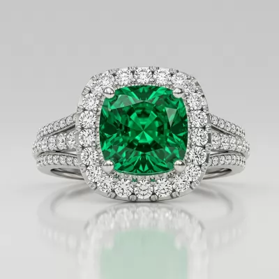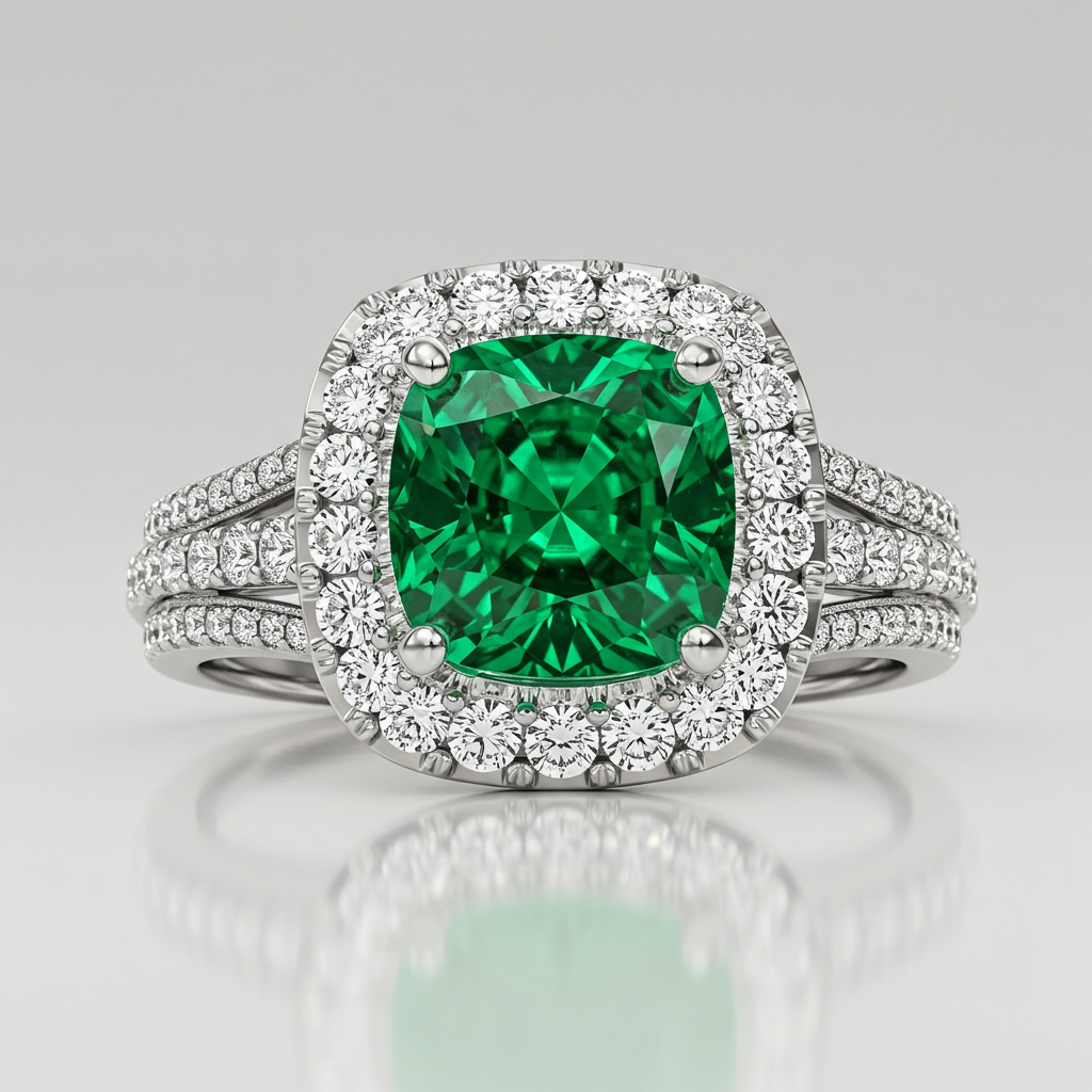 The Emerald Radiance Ring is an exquisite testament to timeless elegance, featuring a brilliant, deep-green, cushion-cut natural emerald as its striking centerpiece. This magnificent stone is embraced by a scintillating double halo of perfectly matched VVS diamonds, catching light from every angle. Crafted in radiant 18KT white gold, the design is elevated by meticulous micro-pave setting extending halfway down the band. This piece seamlessly merges traditional opulence with refined contemporary craftsmanship, perfect for marking life's most cherished occasions.