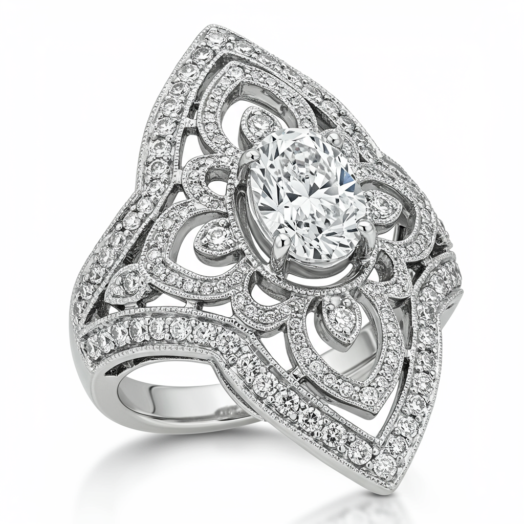 The Millicent Elden Ring is a majestic testament to intricate design, drawing inspiration from ancient regal motifs. Crafted in luminous 18KT white gold, the central setting showcases a captivating arrangement of premium VVS diamonds. This elaborate cocktail ring features precise geometric detailing and pave-set accents, creating an unparalleled sparkle from every angle. It is a bold statement piece designed for the discerning connoisseur of high jewelry.