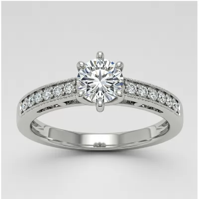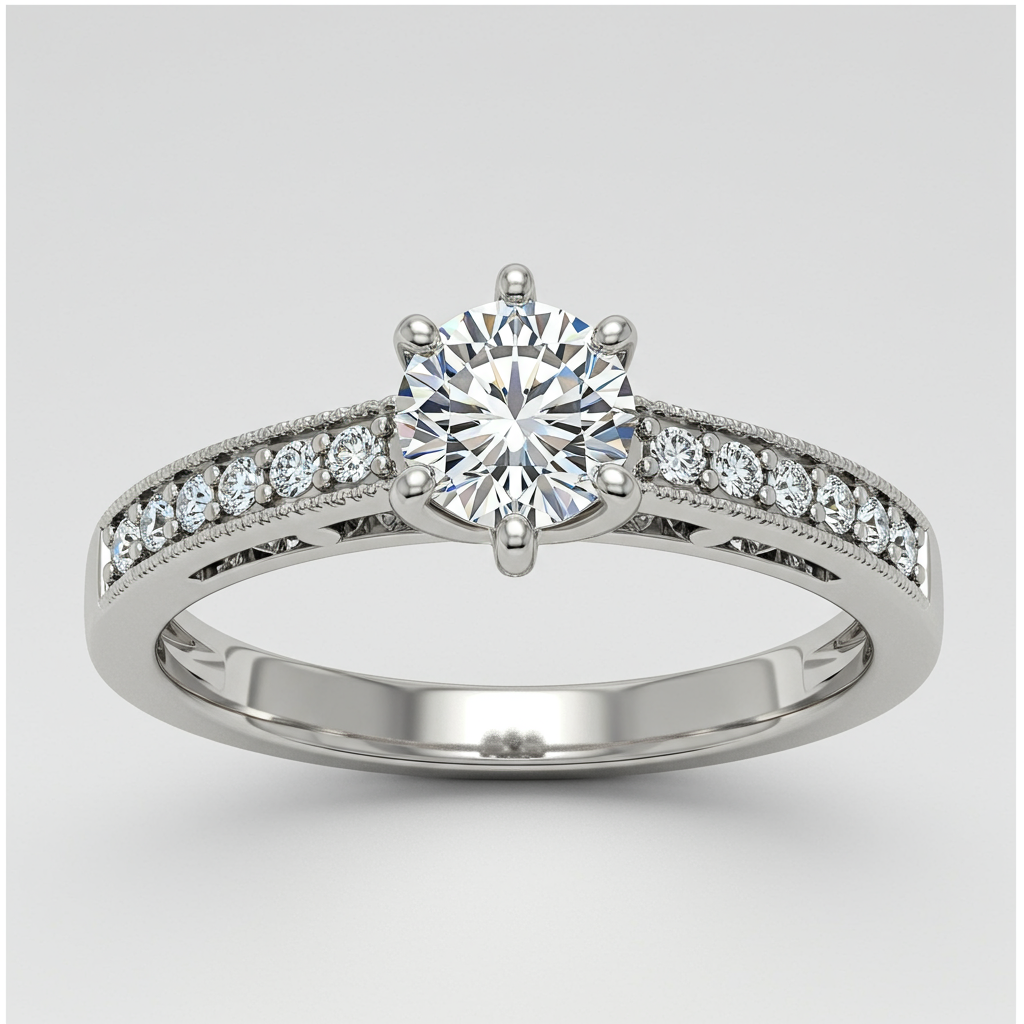 This elegant promise ring symbolizes unwavering commitment, featuring a brilliant center diamond set high in a classic four-prong setting. The delicate 18KT white gold band enhances the stone's radiance, allowing maximum light reflection. Subtle pave accents along the shoulders add a touch of sophisticated sparkle. Crafted with precision, this piece is the perfect first token of eternal devotion, ensuring lasting beauty and quality worthy of your true love.
