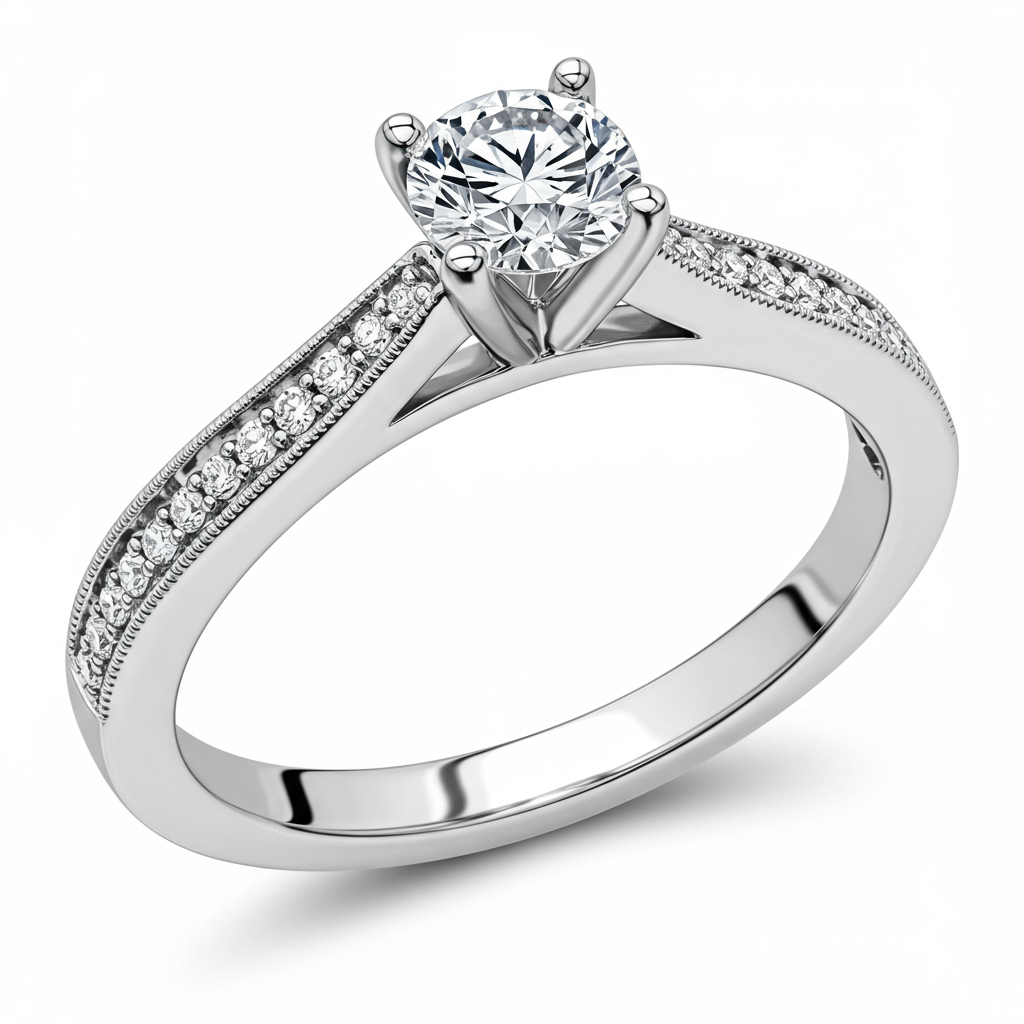 The ultimate expression of eternal love, this breathtaking engagement ring centers a magnificent round brilliant diamond. Set in luxurious 18KT white gold, the sophisticated four-prong basket elevates the center stone to maximize brilliance and fire. The slender band is meticulously adorned with micro-pave diamonds, adding a subtle yet spectacular secondary sparkle. This timeless design is expertly crafted for enduring elegance and serves as the perfect symbol of an unparalleled commitment.